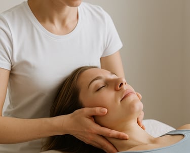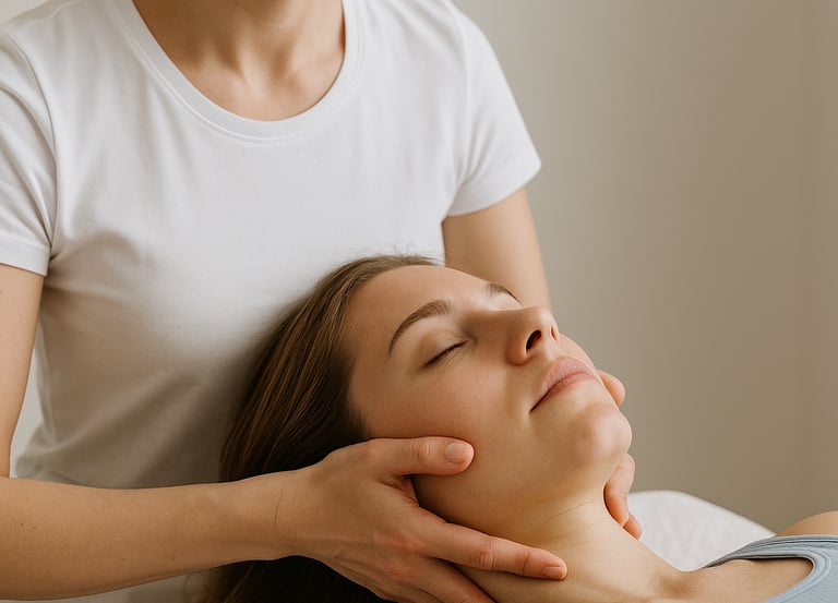 In der physiotherapeutischen CMD-Behandlung steht das Kiefergelenk im Zusammenspiel mit Nacken, Schultern und Kopf im Mittelpunkt.